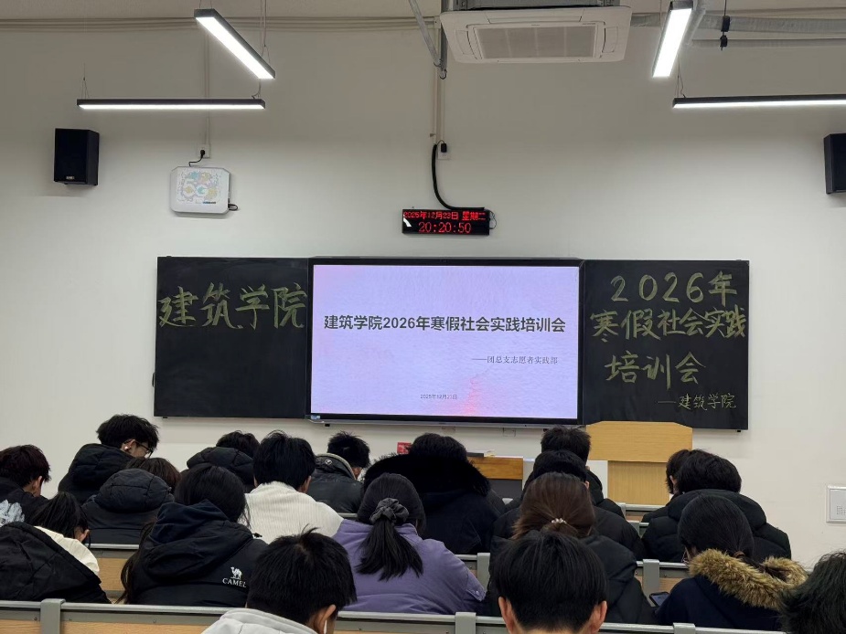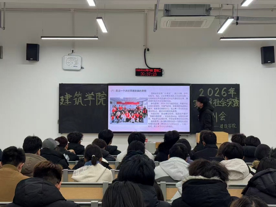 以青春朝气,绘公益华章。为深入学习贯彻党的二十大精神,引导青年学生在社会实践中坚定理想信念、锤炼过硬本领,全面推进2026年寒假社会实践活动高质量开展,建筑学院团总支志愿者实践部组织开展两场专题培训会,为寒假社会实践工作的有序推进奠定坚实基础。 01.统筹规划,明确方向——寒假社会实践培训会顺利举行 12月23日,建筑学院2026年寒假社会实践动员培训会在K1-203教室隆重召开。会议围绕“以青春之志,履公益之行”的活动主题,系统解读了寒假社会实践的整体框架与核心要求。 会上,负责人详细介绍了本次实践活动的七大核心板块,包括学习新思想、基层调研、“返家乡”实践、感恩家人、重返母校、宣传家乡奋斗故事以及讲述燕理故事。七大板块涵盖理论学习、社会调研、志愿服务、文化传播等多个维度,为学生搭建了多元化的实践平台,助力青年学子在不同领域增长才干、服务社会。 同时,负责人明确了实践活动的时间、材料提交等关键事项。针对实践成果,负责人强调需严格按照标准提交视频、图片、心得体会等材料,鼓励同学们在实践过程中严守纪律要求,以实际行动践行青年担当,在服务奉献中实现个人成长。 02.精准指导,赋能实践——“重返母校”专项培训会圆满落幕 为进一步提升“重返母校”实践活动的质量与成效,12月31日,建筑学院于办公楼525会议室组织召开“重返母校”专项培训会。招生办公室张小阳老师受邀出席,为参与学生提供专业指导。 张小阳老师围绕活动筹备、实践内容、宣传要点等方面展开详细讲解。他指出,“重返母校”实践活动不仅是一次感恩之行,更是一次文化传播之旅;鼓励同学们要主动站上讲台,向学弟学妹们分享高考备考经验与志愿填报技巧,积极传递“与更好的你相遇”的校园文化理念。 在互动答疑环节,张小阳老师针对同学们提出的母校对接流程、宣传材料制作、实践安全注意事项等问题进行了逐一解答,帮助同学们进一步理清实践思路,明确任务分工,为高效开展实践活动提供了有力保障。 此次系列培训会的成功举办,帮助同学们清晰掌握了寒假社会实践的各项要求,明确了实践方向。建筑学院将以此次培训会为契机,持续加强对学生社会实践的指导与服务,鼓励全体学子以青春之姿投身实践,以奋斗之态服务社会,在广阔的实践舞台上展现燕理建筑学子的责任与担当,书写无愧于时代的青春华章。